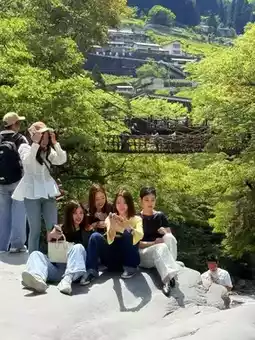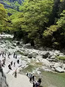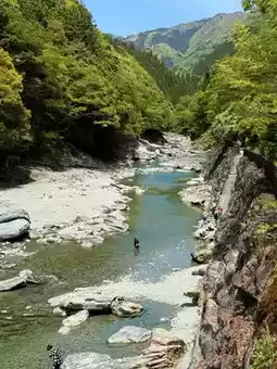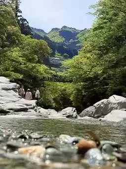Beyond the shop, a staircase leads down to the Iya River. Here, you can take photos with the vine bridge and the rocky river backdrop, while marveling at the grandeur of the water. The Iya River stretches for 20 kilometers, flanked by cliffs and steep walls that seem to have been split by nature itself. The river flows through Oboke and Koboke, and during autumn, the crimson foliage against the cliffs is breathtaking. If time permits, you can join a half-day rafting tour to admire the awe-inspiring landscapes carved by millions of years of erosion.