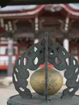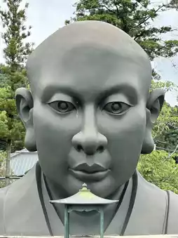 An unfinished large bronze statue of the founder Nichiren is temporarily placed