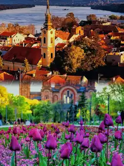 (Aerial shot of Belgrade Old Town + slow-motion café scene)