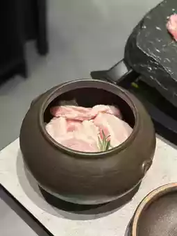 Jeju pork belly is served in a jar, with a generous portion and good presentation. Staff assist with grilling the meat throughout, so you can enjoy it without lifting a finger. The pork has a rich texture with alternating fat and lean parts, and pairing it with different seasonings (rock salt, mustard, sesame oil, Korean chili paste, etc.) adds layers of flavor!