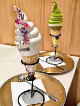 Aesthetically very beautiful – so pretty you don’t want to ruin it🤭 Decorated with edible dried flowers 🪻 plus fragrant and smooth milk ice cream – underneath there are blueberries, jam, cheesecake, and more – rich layers🫐🫐