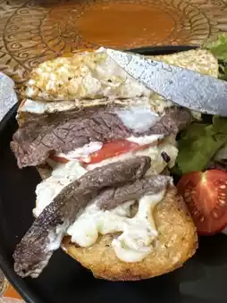 The highlight is the two runny eggs, with the yolk oozing into the toast. The fully-cooked beef tenderloin is tender, and the mashed potatoes are light in color with a subtle garlic aroma.