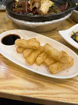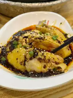 In addition to the hot pot, we also ordered spicy shrimp and mouthwatering chicken. The shrimp was incredibly bouncy, and the sauce was both spicy and appetizing. The mouthwatering chicken had a perfect balance of sour, spicy, and numbing flavors, with tender and smooth meat. For dessert, we had brown sugar glutinous rice cakes, which had a crispy exterior and a soft, chewy interior, providing a nice balance to the heavy flavors and making for a delicious yet not overly rich ending.