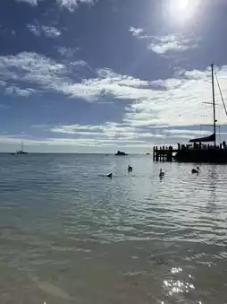 The shallow, wide beach is perfect for walking and enjoying the clear blue water. The dolphin show is so fun—you can get close and watch these gentle creatures play.