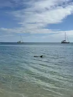 As these are wild dolphins, sometimes only one shows up, while other times, around ten might appear. There are also mornings when they don't come at all. However, during our two-day stay, we were lucky to see them both days 🐬.