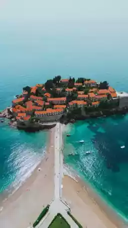 🏝️ Sveti Stefan Island, a small island connected to the mainland by a sandy bridge, is a luxury resort that has hosted international celebrities. The view from the beach across the river is one of Montenegro's most beautiful photographs.