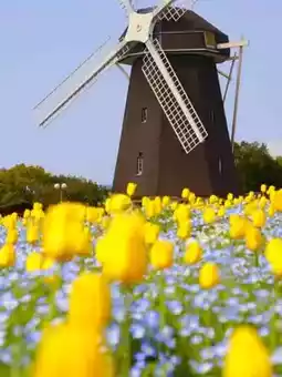 The Dutch Windmill: Iconic and surrounded by seasonal flowers