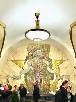 🎯 Komsomolskaya metro station (Line 5): You can look for the Komsomol emblem on top of the limestone column. The tiles are marked with images of hard-working volunteers. If you don’t have time, you must go to this place!