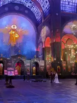 2️⃣ Main hall mosaic dome: Wide-angle shots of dome frescoes with angels and fighter jets in the same frame.