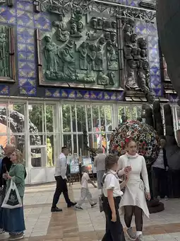 - Paintings filling gallery walls with bright colors and narratives of Russian history.