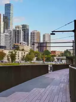 It's quiet here. Only footsteps, rustling leaves, and gentle waves. Bike paths, panoramic viewpoints of Moscow-City, and benches right by the water — perfect for coffee at dawn or wine at sunset.