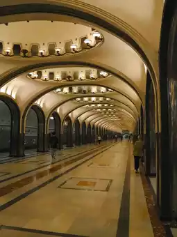 An iconic symbol of Moscow’s subway system and a masterpiece of Art Deco design. Its ceiling is adorned with mosaics, while metal and marble create a palace-like atmosphere.