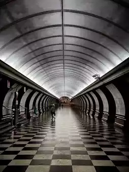 One of the deepest stations globally, housing massive mosaic compositions depicting heroic deeds from World War II.