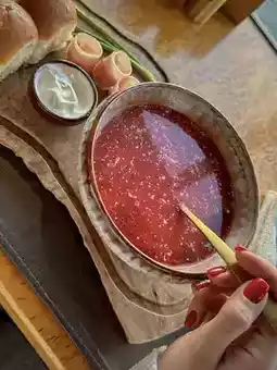 🍲 The menu features classic Russian dishes with a modern twist: Olivier salad, dumplings, rasstegai pies, stuffed cabbage rolls, and the iconic borscht. Thick, flavorful, served with pampushki, slices of lard, fresh herbs, and sour cream. A perfect balance of homemade taste and refined presentation.