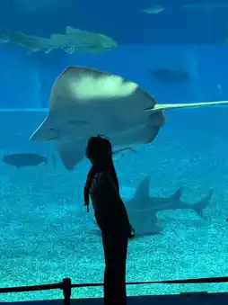 Tickets are 2,180 yen for adults and 4,360 yen for an annual pass, which is suitable for multiple visitors. Surrounding facilities include the Dolphin Theater and the beach. It is recommended to take the park shuttle bus for a tour. The in-house restaurant "Ocean Blue" is located near the water tank and offers light meals with a sea view, but you need to reserve a seat in advance.