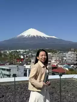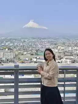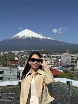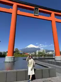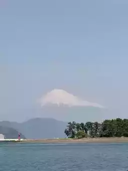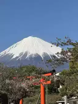 A breathtaking view of Mount Fuji, Japan's iconic peak, showcases its majestic snow-capped summit against a clear blue sky. Surrounded by lush greenery, tranquil lakes, and traditional landscapes, the scene captures the serene beauty of nature. This picturesque vista embodies the harmony between the mountain and its environment, inviting admiration and reflection on the cultural significance of Mount Fuji in Japanese heritage.