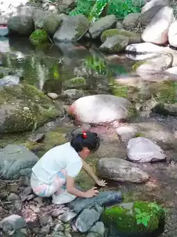 shaded by lush trees—perfect for kids to splash and catch fish.