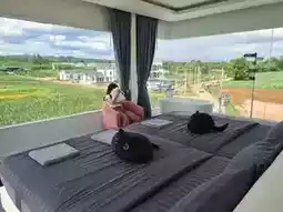 Khao Yai Pool Villa 3 is a pool villa located in Pak Chong District, Nakhon Ratchasima Province. It is a very large pool villa. The accommodation is beautifully decorated in a minimalist style. There are many photo spots. The accommodation has 3 floors in total. There is a swimming pool with a slide. There are 7 rooms in total. It can accommodate more than 20 people. The 3rd floor has 2 rooms. Each room has a bathtub for soaking and enjoying the view. Through the glass in the room. The 2nd floor has 3 rooms in total. And there is 1 dome room. On the ground floor, there is 1 bedroom. Karaoke room and a pool table. And there is a kitchen area with complete facilities Ready for cooking and partying. In addition, the accommodation also has ATVs for driving around the accommodation. For those who have a lot of friends and love parties and don't have any plans to go anywhere, I would recommend this pool villa. It meets the needs very well. Address: Ban Khlong Din Dam, Khao Yai, Tambon Mu Si, Amphoe