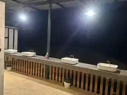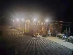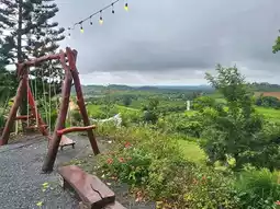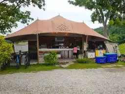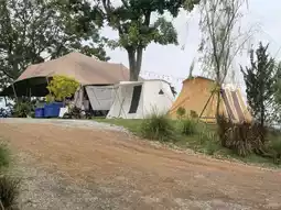 A tent site on a hill with a view of the mountains. You can see the view in 360 degrees. There is also a cafe on the ground.