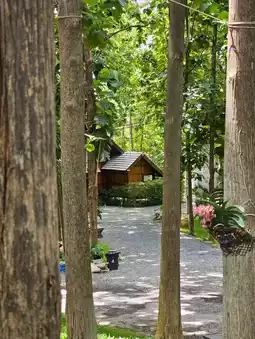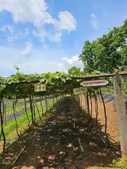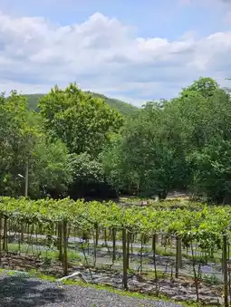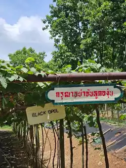 A vineyard cafe with a super chill atmosphere, surrounded by lush trees, located in Muak Lek District, Saraburi Province. The cafe is decorated in shades of gray, contrasting with the lush greenery, giving it a Chiang Mai-like feel. There are both outdoor and indoor seating areas. The outdoor area is camping-style, offering mountain views and a green vineyard, while the cool breeze blows.