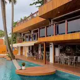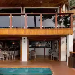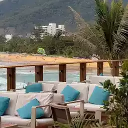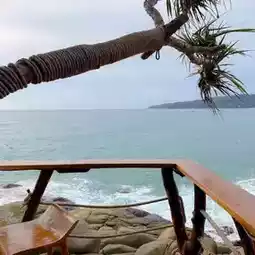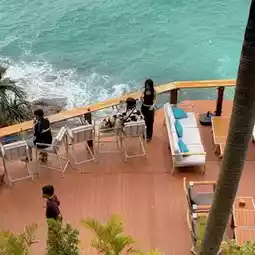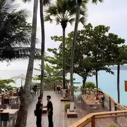 A newly opened cafe and beach club in Phuket with absolutely breathtaking vibes. The venue is beautiful with an amazing view, located right by the sea and overlooking Karon Beach. The establishment is perched on a cliff, with a stepped pathway leading down to different levels. It features a bar zone, a cafe zone, and a dining area. The highlight spot you must check in at is the staircase leading downwards—this spot is super popular and offers a stunning backdrop. The mood and tone inside the venue are fantastic, giving off a beach club vibe with fun music.
