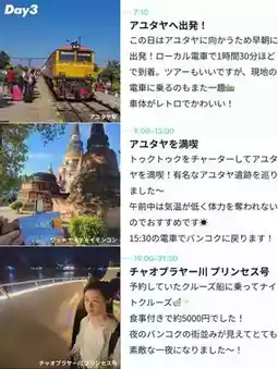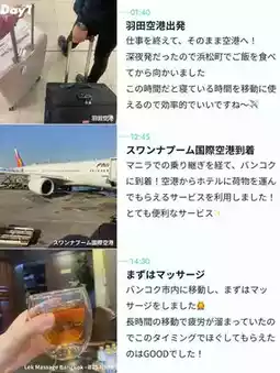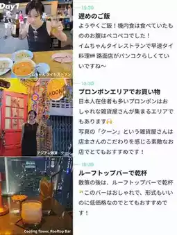 1️⃣Day101:40|Depart from Haneda Airport12:45|Arrive in Bangkok🇹🇭14:40|Massage15:30|Eat Thai food (Imchan Thai Restaurant)16:30|Shopping in the Phrom Phong area (Recommended: Asian goods - Khun)18:30|Cheers at the rooftop bar🥂(Cooling Tower, Rooftop Bar)