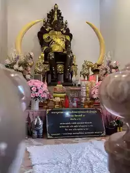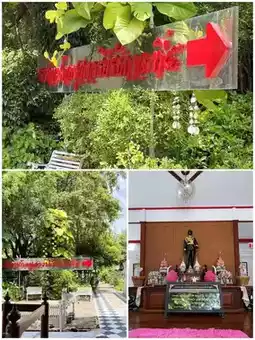 We then proceed to the second stop, exiting the Reclining Buddha Vihara, just before the left exit. The large, bright red sign reads, "King Rama V Monument Palace." The palace has two floors. The ground floor welcomes you, clean and beautifully decorated with pink carpets and roses. It houses a collection of information on His Majesty's life, including the "Pak" cookbook, an ancient Thai cookbook. The entrance is adorned with a white, pointed archway and a miniature European-style dome. Upon entering, we paid our respects to King Rama V, seated in his stately pose, adorned with a pair of ivory tusks, and prayed for positive energy and peace of mind.