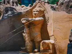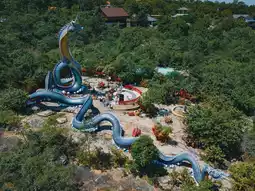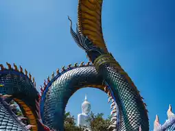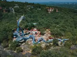 The enormous Naga statue at Phu Manorom Temple in Mukdahan Province 🐍 is a breathtaking sight. Known as "Grandfather Sri Mukda," this sculpture depicts a Naga coiled gracefully on a rocky plateau atop a mountain. The statue measures 122 meters in length and 20 meters in height, with its neck elegantly raised, standing out amidst the lush forest and facing the Mekong River. Its greenish-blue hue shimmers beautifully under sunlight, giving it a lifelike appearance. The intricate patterns on its body are exquisitely detailed and truly magnificent.