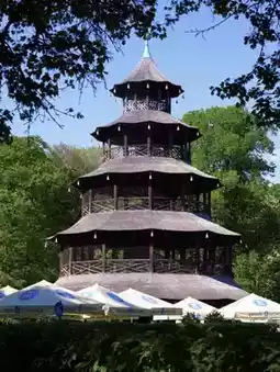 It's curious why Munich has an English Garden, and even more surprising, there's a Chinese Tower within it. Beneath the Chinese Tower is a beer garden, a place with seating where you can buy beer.