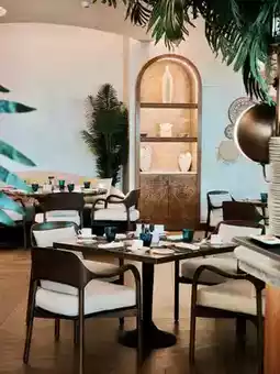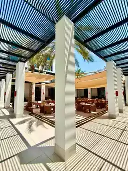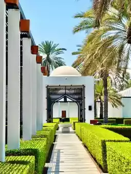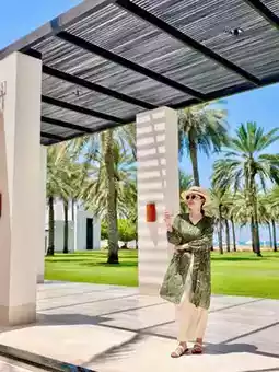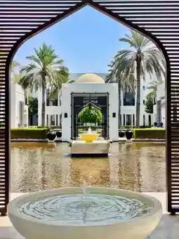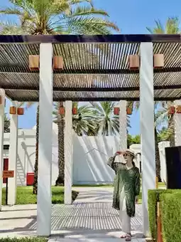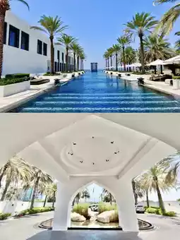 🍽️ We also went to the Chedi Muscat hotel for lunch. As soon as you enter, the frankincense mixed with the salty sea breeze instantly relaxes you—they truly understand the relaxed feeling of a vacation! White buildings with Arabian arches, corridors lined with tall palm trees, and sunlight filtering through the leaves creating patterns on the ground—every step feels like walking through a time tunnel.