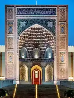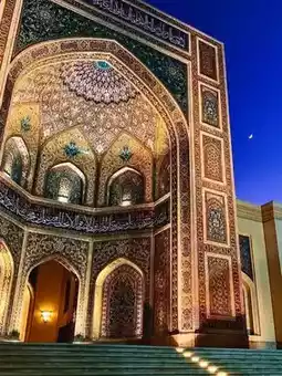 • Elegant Interior: The prayer hall is adorned with a breathtaking chandelier, rich turquoise and gold tilework on the mihrab, and smooth white marble floors.