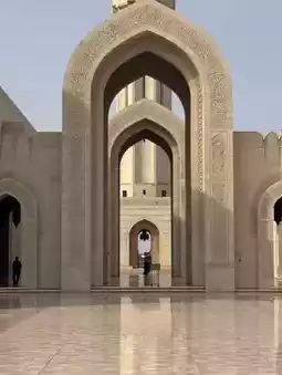 The mosque's grand design, featuring a massive dome and a 90-meter-high minaret, is a striking landmark visible from afar and a "architectural sculpture" reflecting the grandeur of Islam in Oman.