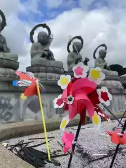 I visited Mount Osore on the Shimokita Peninsula in Aomori Prefecture. The surrounding area is filled with the smell of sulfur, a desolate landscape with few plants, rattling windmills, and the famous Itako (Japanese medium) singing, all of which activates all five senses. There is also a free hot spring where you can purify yourself before praying. It takes about an hour to walk around the whole area, so sneakers are recommended. The atmosphere makes you feel like you are close to the other world, and it's strange how a sacred feeling develops while praying. I thought of my deceased family members.