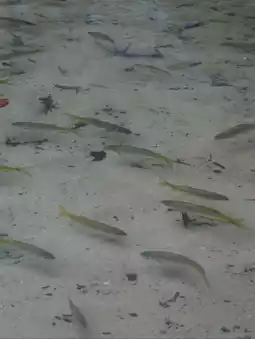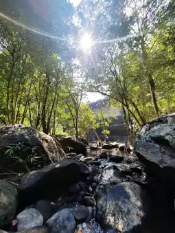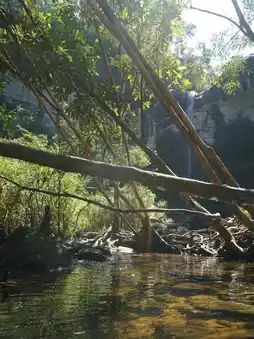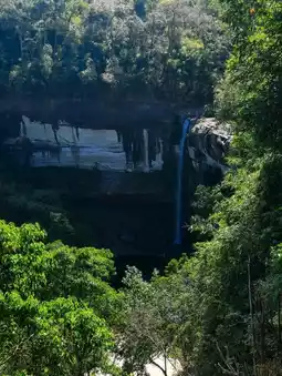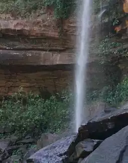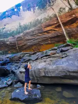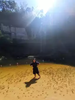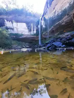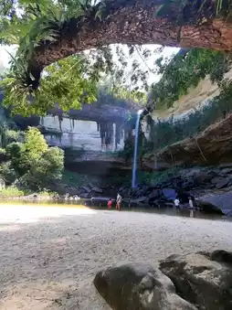 ✨️The highlight is the spectacular sheer sandstone cliffs. The waterfall cascades down a 40-meter-high cliff, with pools where you can swim in some areas. Schools of fish fill the pools, and there's a sandy beach leading right to the waterfall, making it feel like you're at the beach. Nearby, or around the area, there's a stream flowing over rocks, perfect for soaking your feet.