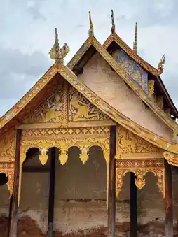 Notable features include the pediment, the support beams, and the exterior decorations, which are intricately carved in wood, featuring spiraling patterns, scrollwork, naga, and scenes from the Ramayana, and Indra riding his elephant Erawan.