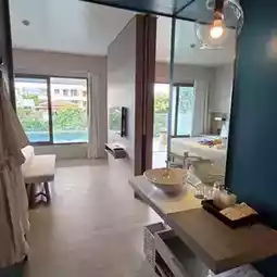Veranda Resort Pattaya - Jomtien Beachfront. We booked a pool suite with a large bedroom and living room with bunk beds, a bathtub, a balcony, and a swimming pool. It was wonderful, private, and spacious, perfect for families with children. The hotel welcomed us with great hospitality, clean rooms, and excellent amenities. The breakfast was excellent and delicious. The environment was pleasant, and the staff were friendly.
