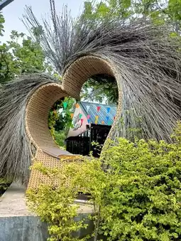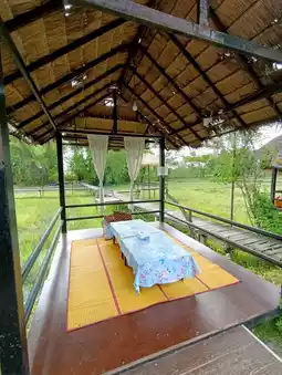 A cafe and restaurant with a nice atmosphere, rice field view, sip coffee and rice fields, and experience the nature of the green rice fields. The shop is spacious, with many seating areas to choose from, both rice field view and beautiful blue ponds. It is a private hut, suitable for families or to chill with friends. There is a long bridge down to the rice fields for you to walk beautifully. It is another cafe with beautiful photo corners with nature, like you are really relaxing.