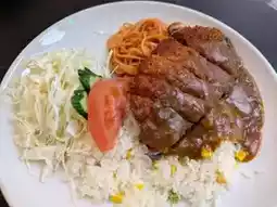 -🍜 "Turkish Rice", a baffling assemblage of Western-inspired goodies: pilaf rice, ketchuppy spaghetti, and pork cutlet topped with curry.