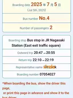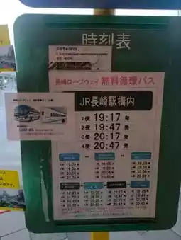 Travel details can be found at the bus stop on the right-hand side of the JR Nagasaki station. The sign will show details on how to access the website to reserve seats and free shuttle bus times.