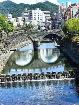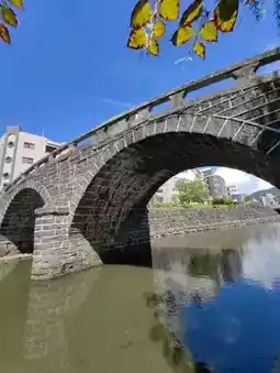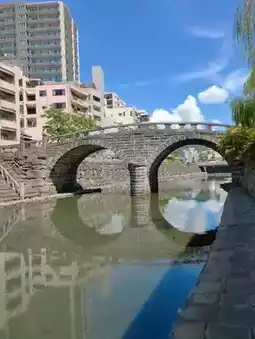 Nagaki City, Nagasaki Prefecture, spans the Nakajima River. The bridge is 22 meters long, 3.65 meters wide, and stands 5.46 meters above the water. Built in 1634 under the supervision of Kofuku-ji Temple's abbot, Mokushi Nyosho, it is Japan's first stone arch bridge and one of Japan's three most famous bridges.