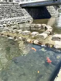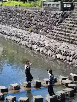 Nagaki's Important Cultural Property, Spectacles Bridge was closed to vehicles in 1953. Pedestrians can now stroll freely across the bridge or take the stairs down to the river for a unique perspective. The Nakajima River is a great place for a stroll, with the willow trees and river creating a picturesque scene. The water is clear and teeming with fish, a delight to behold. The bridge also features numerous stone sculptures for photo opportunities.