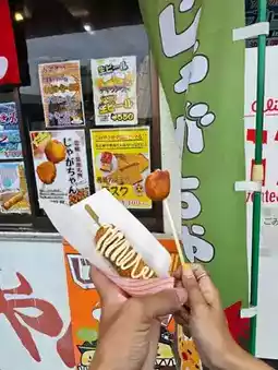 A whole Shimabara potato is steamed, wrapped in a secret batter, and deep-fried twice, and costs about 200 yen for one skewer (2 pieces)