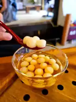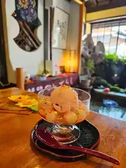 Kanzashi: A traditional Shimabara sweet made by cooling small shiratama in famous spring water and topping it with a refined syrup. It has a chewy texture and refreshing sweetness.
