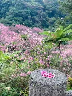 The winter cherry blossoms are in full bloom from late January to early February, making it a famous cherry blossom viewing spot in Okinawa Prefecture.