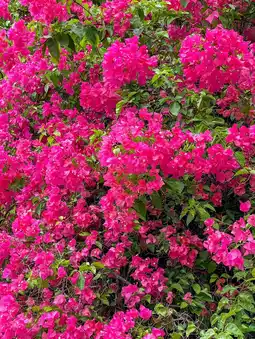 Bougainvillea blooms in full glory all year round behind the parking lot and the front of the building.