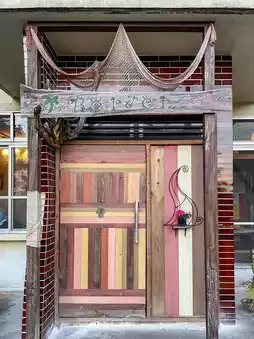 The interior of the building has an Asian-style wooden warmth and a handmade feel.