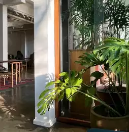 A comfortable space with several types of seatings, many charging spots, fast wifi, and well-lit room.