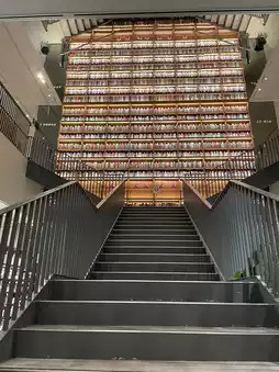 The staircase connecting the first and second floors is a giant bookshelf, and the mirrored ceiling makes it an Instagrammable spot.