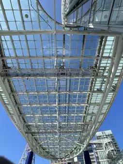 Get on the futuristic elevator and go up... Water flows on the glass roof, creating beautiful ripples.