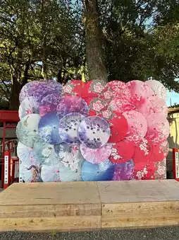Upon entering the shrine, the most striking feature is the 'Paper Umbrella Tunnel' at the entrance. Numerous colorful Japanese umbrellas hang in front of the torii gate, with red, white, purple, and blue hues intermingling. Traditional Japanese patterns coexist with modern design, resembling a radiant art installation. Standing in the breeze, sunlight filters through the umbrellas, casting vibrant shadows, making one feel as if they are at a festival in the Edo period.